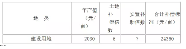 1.农用地:土地补偿费标准为统一年产值(2030元/亩)的9倍,即18270元/亩;安置补助费标准为统一年产值(2030元/亩)的15倍,即30450元/亩。总计农用地补偿标准为48720元/亩。