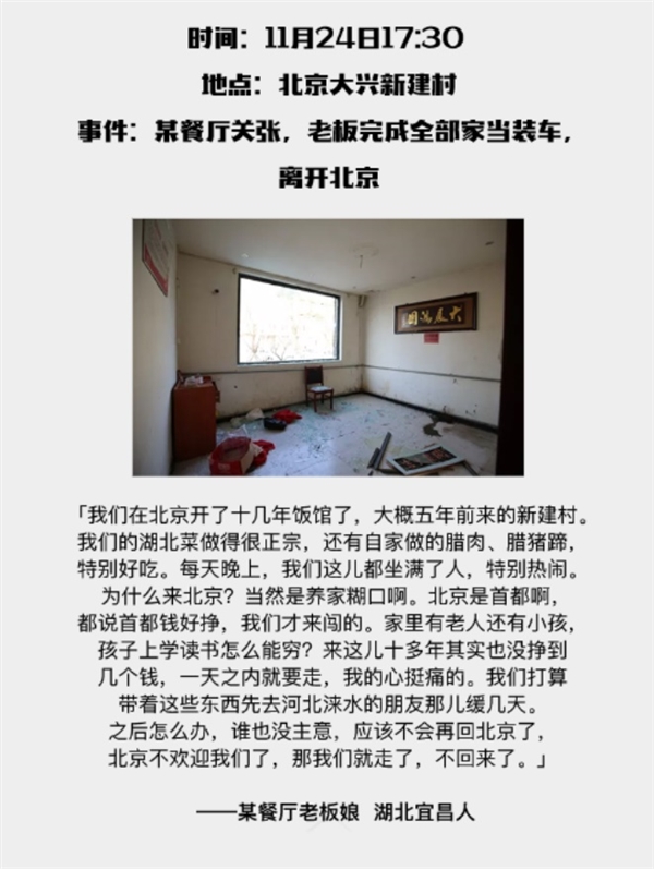 因为大兴的一场火灾事故,北京这个神奇的首都,开始了大规模的外来人口整治,拉开了在京漂泊和拼搏的打工一族的大迁移序幕!看完了么?这就是现实的!